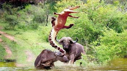 水牛“反击”鳄鱼,鳄鱼“落荒而逃”
